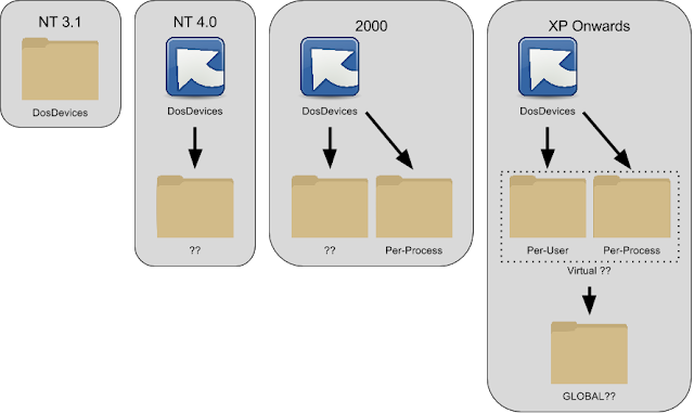 To add a further complication Windows 2000 introduced the concept of a per-process DosDevices directory. This can be specified by calling the system call NtSetInformationProcess with the ProcessDeviceMap information class passing the handle to a new object directory. On Windows 2000 this just replaces the ?? directory lookup entirely, however on XP and above the fallback to GLOBAL?? still occurs. This is only used when the lookup is occurring within the same process, no other process on the system see the new DosDevices map.