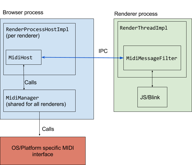 Subclasses of MidiManager contain the platform specific implementation for interfacing with MIDI devices. One thing to note here is that MidiHosts live only as long as the renderer process. The MidiManager lives for as long as the browser lives.