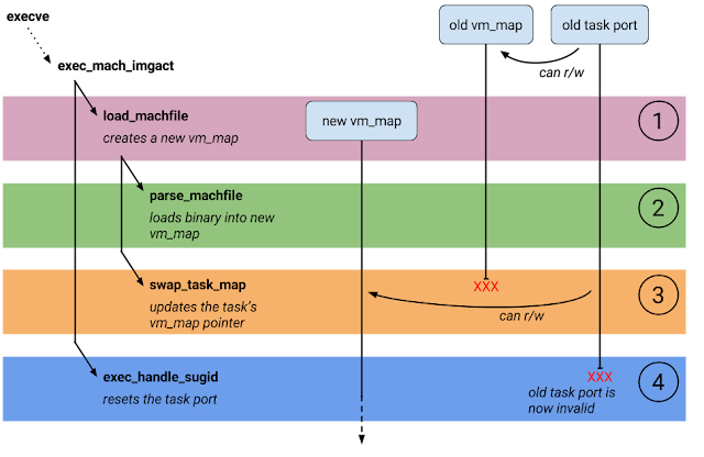 Usually new task ports will only be created when new processes are created (via fork or posix_spawn). Just execing a new binary won’t reset the task port. This leads to the obvious question: since having a send right to a process’s task port give you complete control over that process, how do they deal with SUID binaries where the exec call will increase the privileges of the process?